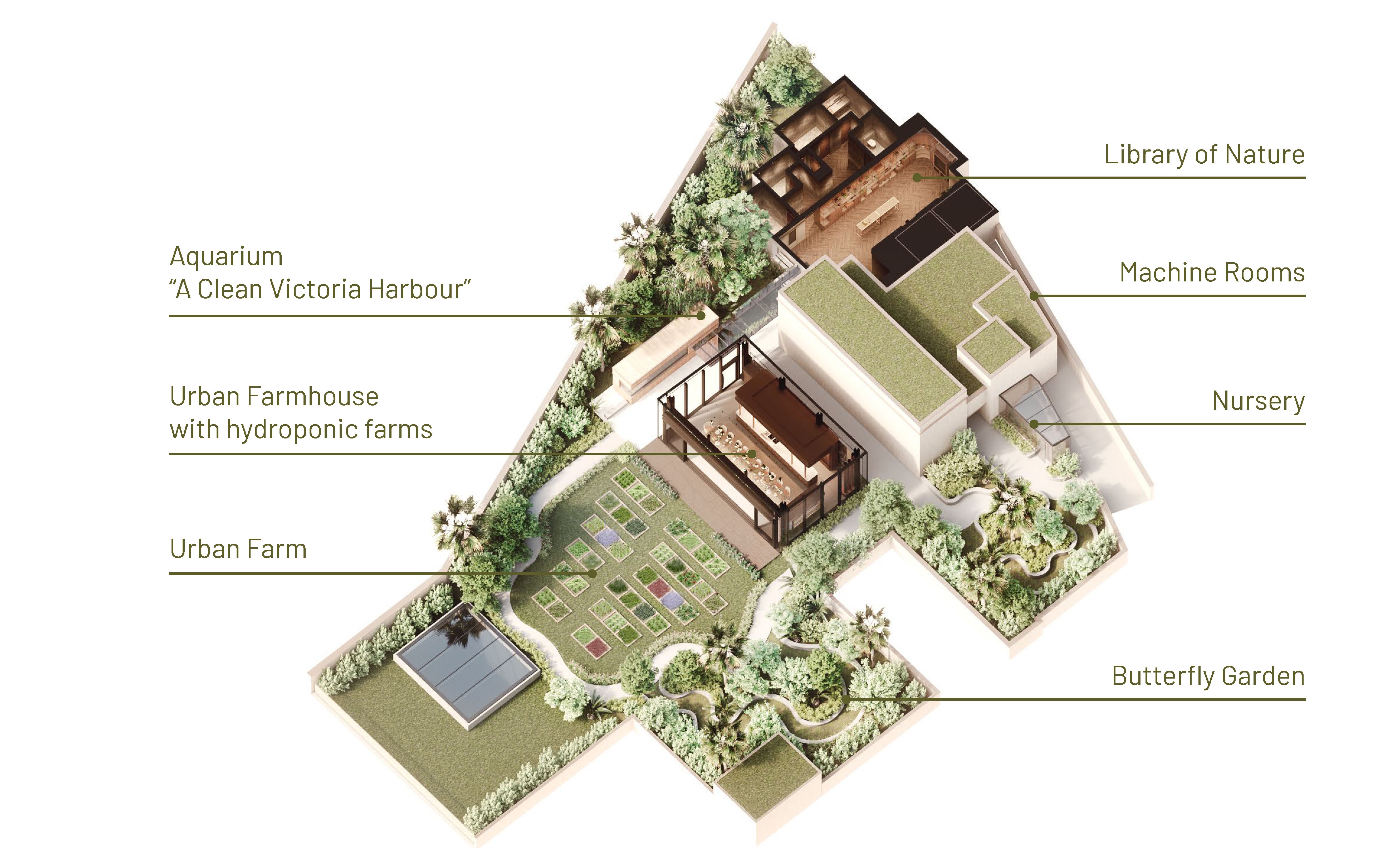 The spatial design of Nature Discovery Park advocates for the co-existence of human, nature, and the urban environment by enabling eco-tours and a series of education programmes on biodiversity and sustainability. The nature exploration journey begins with an archive that showcases rare butterfly species, leading to an aquarium that hosts the water and tropic marine species of the Victoria Harbour across the site if there were no pollution. Inside the greenhouse, a hydroponic nursery brings organically grown vegetables to the table. The farm in front of the glasshouse offers urban farming opportunities for city dwellers, promoting eco-parenting through activities such as rooftop farming and nature art jam. As Hong Kong is home to a dazzling diversity of butterfly species, the nature discovery journey ends with a butterfly garden that grows plants to attract butterflies.