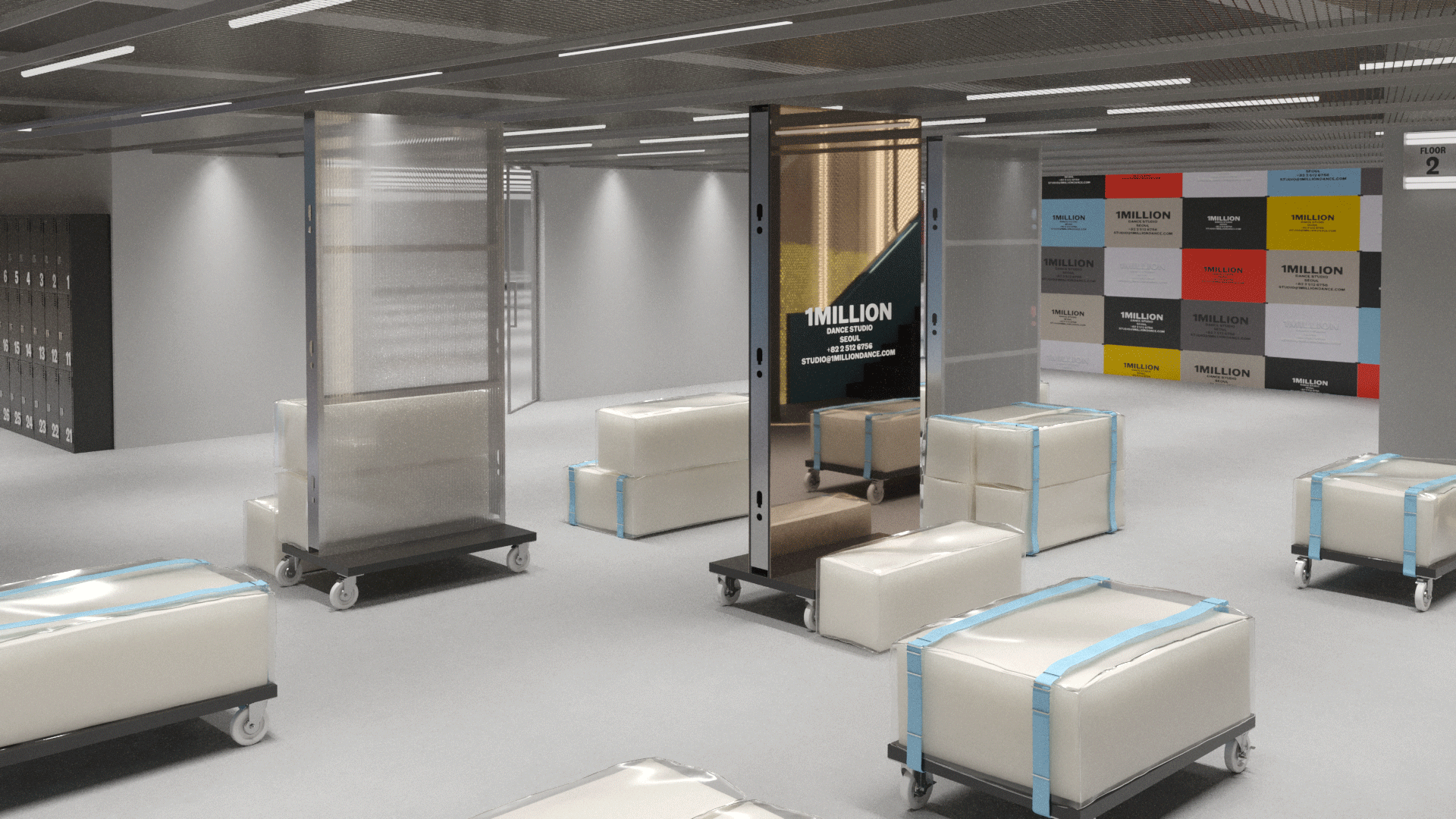 Project Description: The first two levels include 2 large dance studios, changing rooms and lockers to accommodate over 120 students at a time, modular installations that can be used as merchandise displays and resting spots for students, a welcome/registration area, and a lounge area. The third and fourth levels are dedicated to 1MILLION management studio and employees’ offices and include a professional photography studio. The base building, layout and façade were conceived by a local architecture firm. TUX’s environmental and experiential interventions complement the building’s architecture and help express the brand’s revived image.