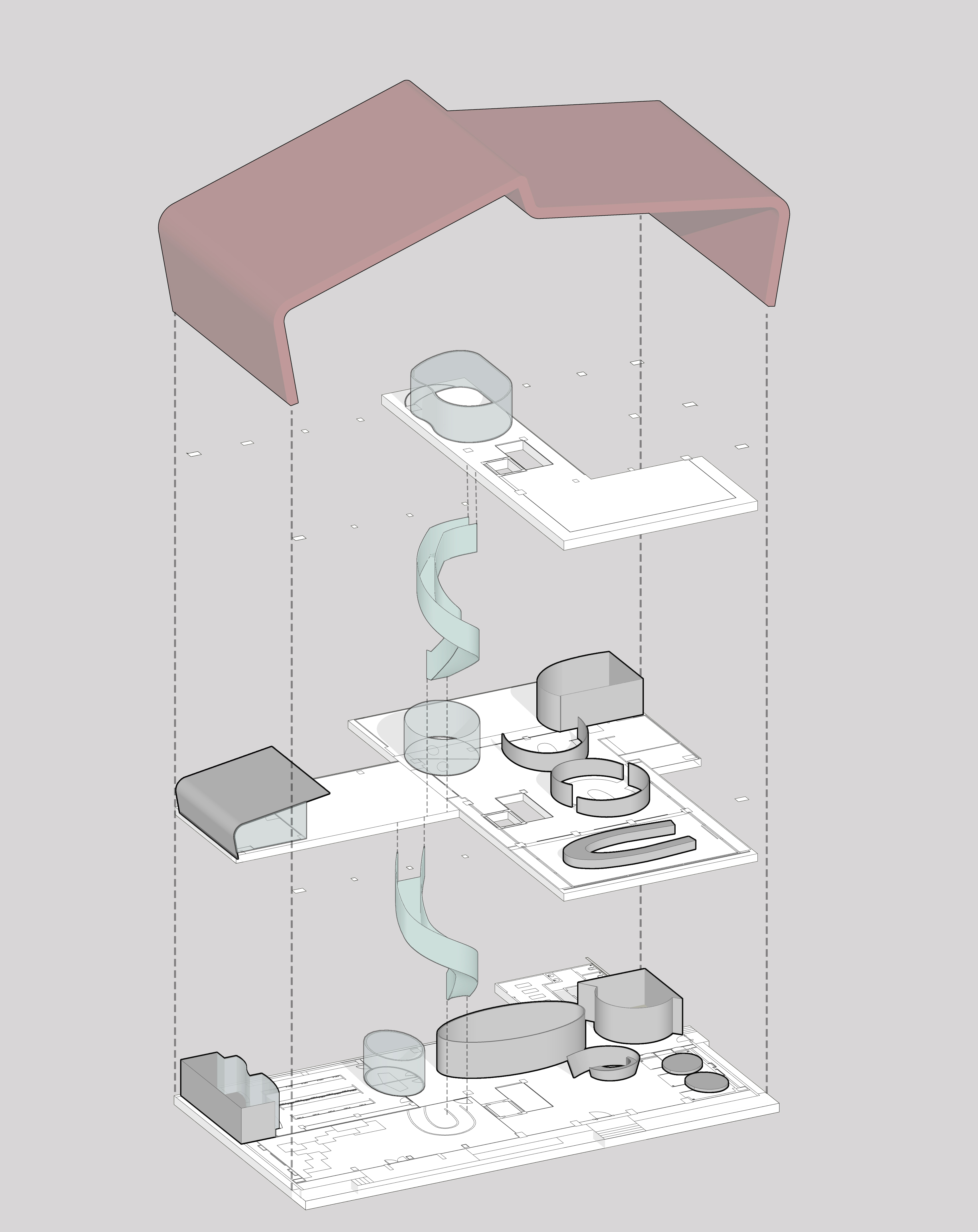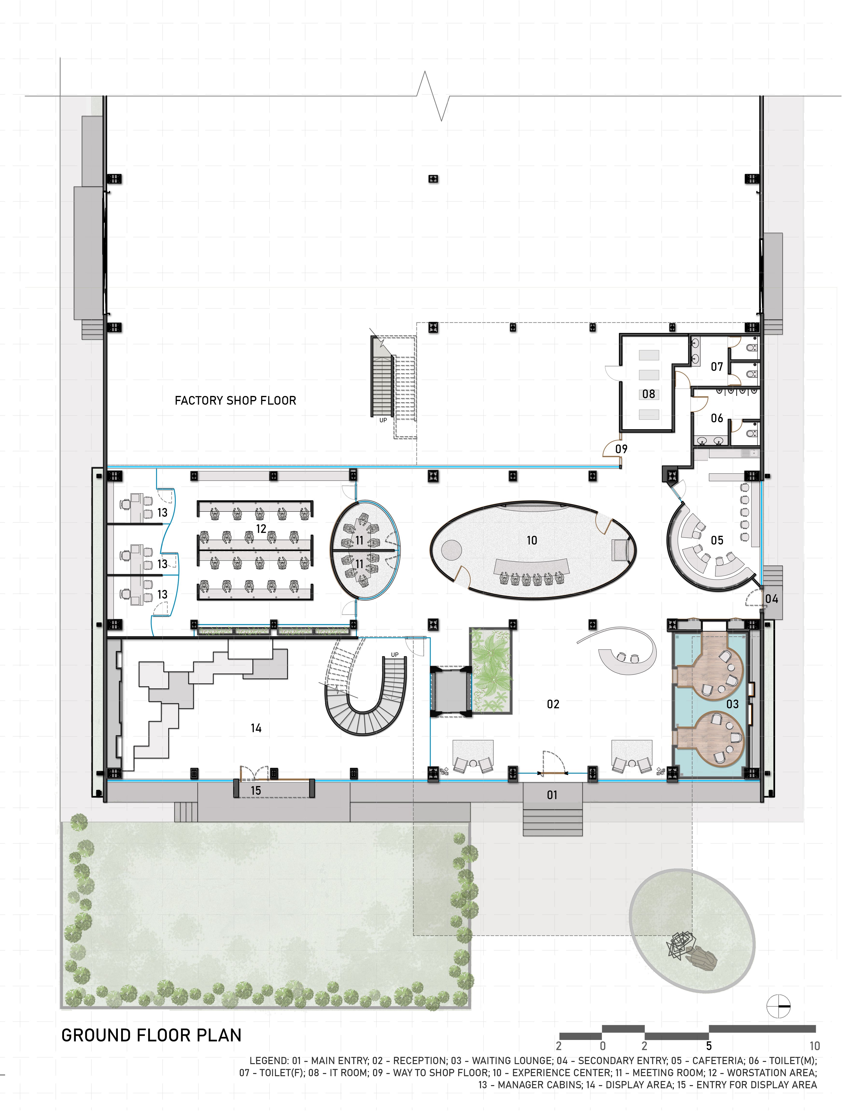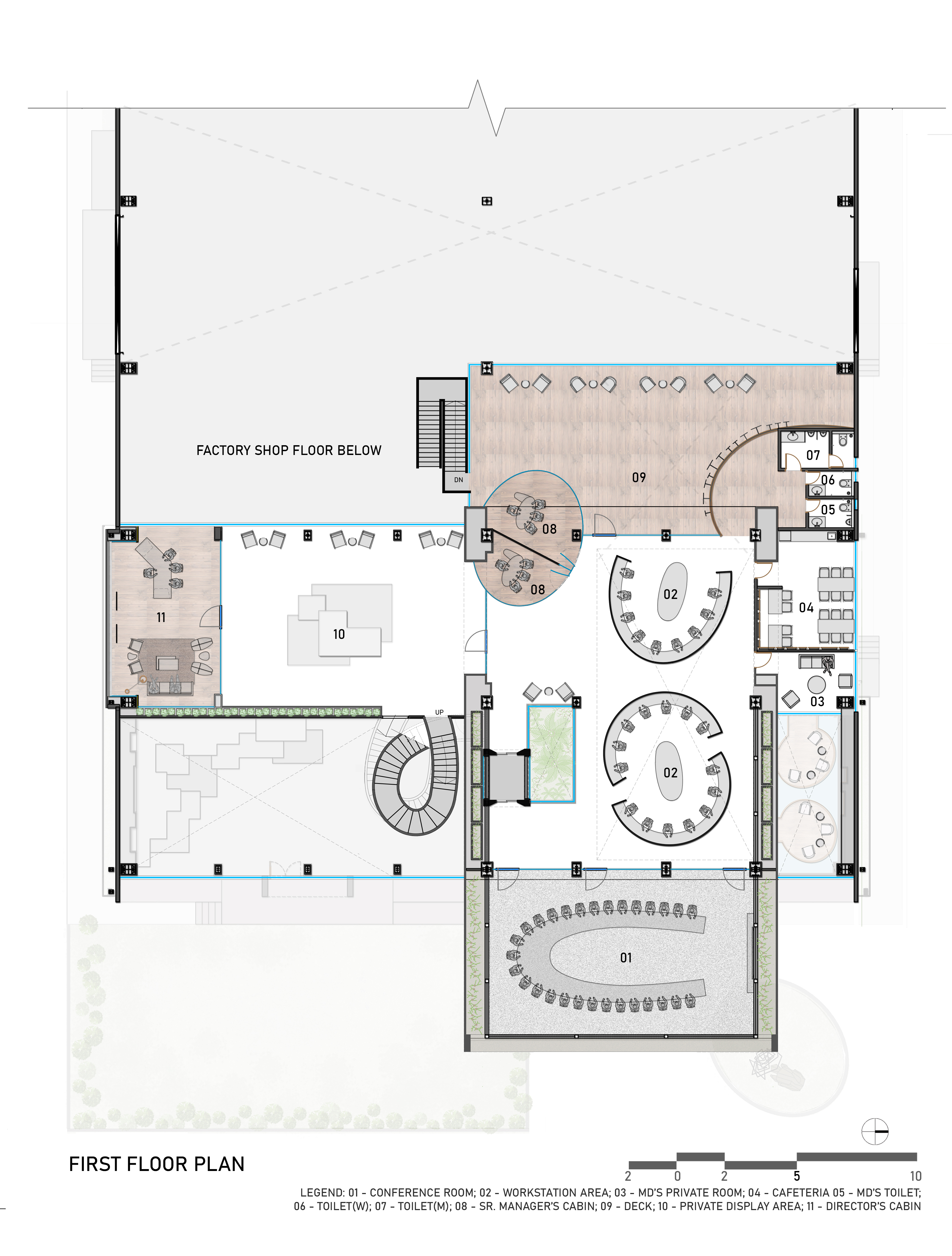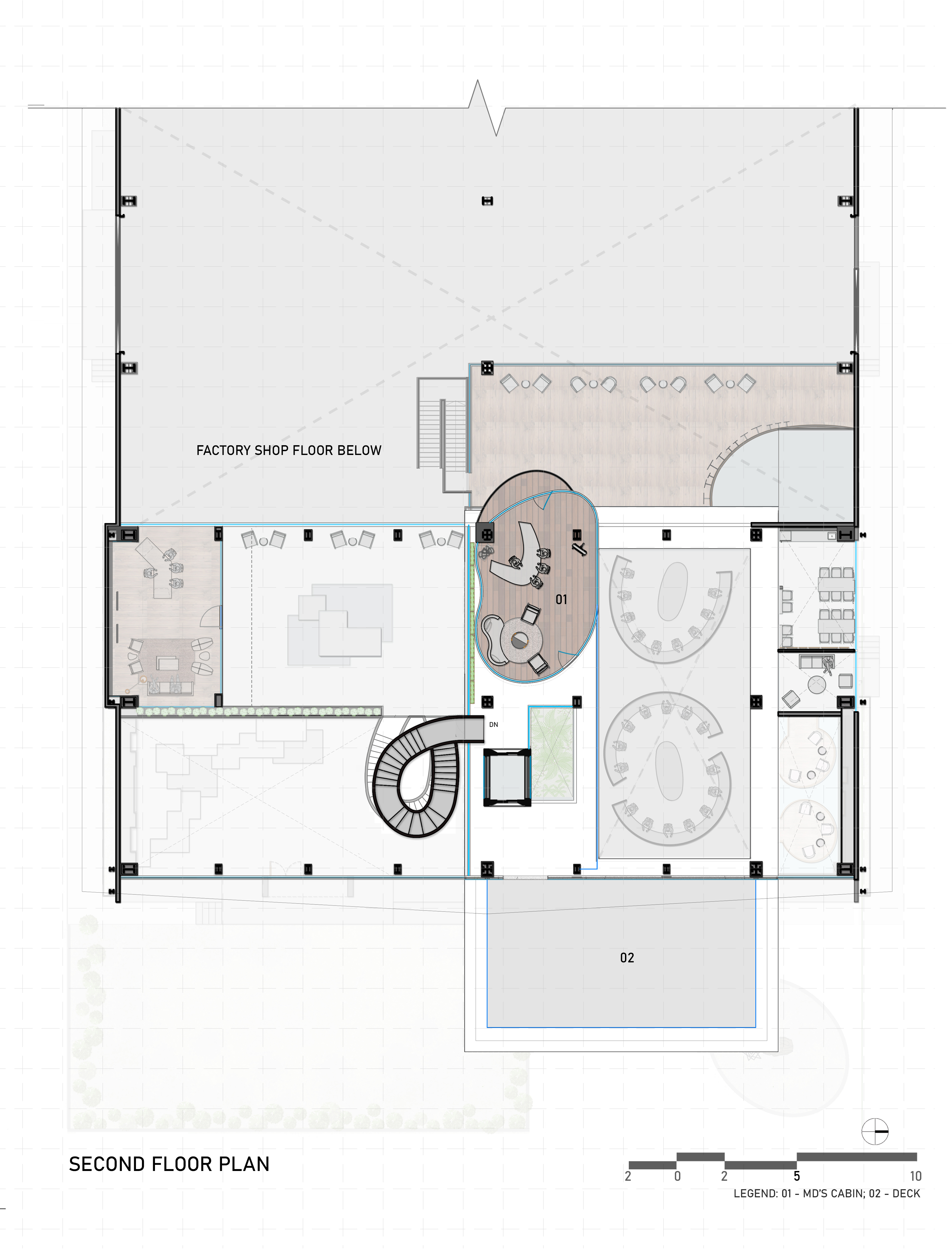 Towards one side, a 36’ high multifunctional space with movable modular platforms is designed to be used as a furniture display space, a seminar hall or a social interaction space. A cantilevered sweeping stairway spirals asymmetrically through this volume connecting the 3 levels of the office.