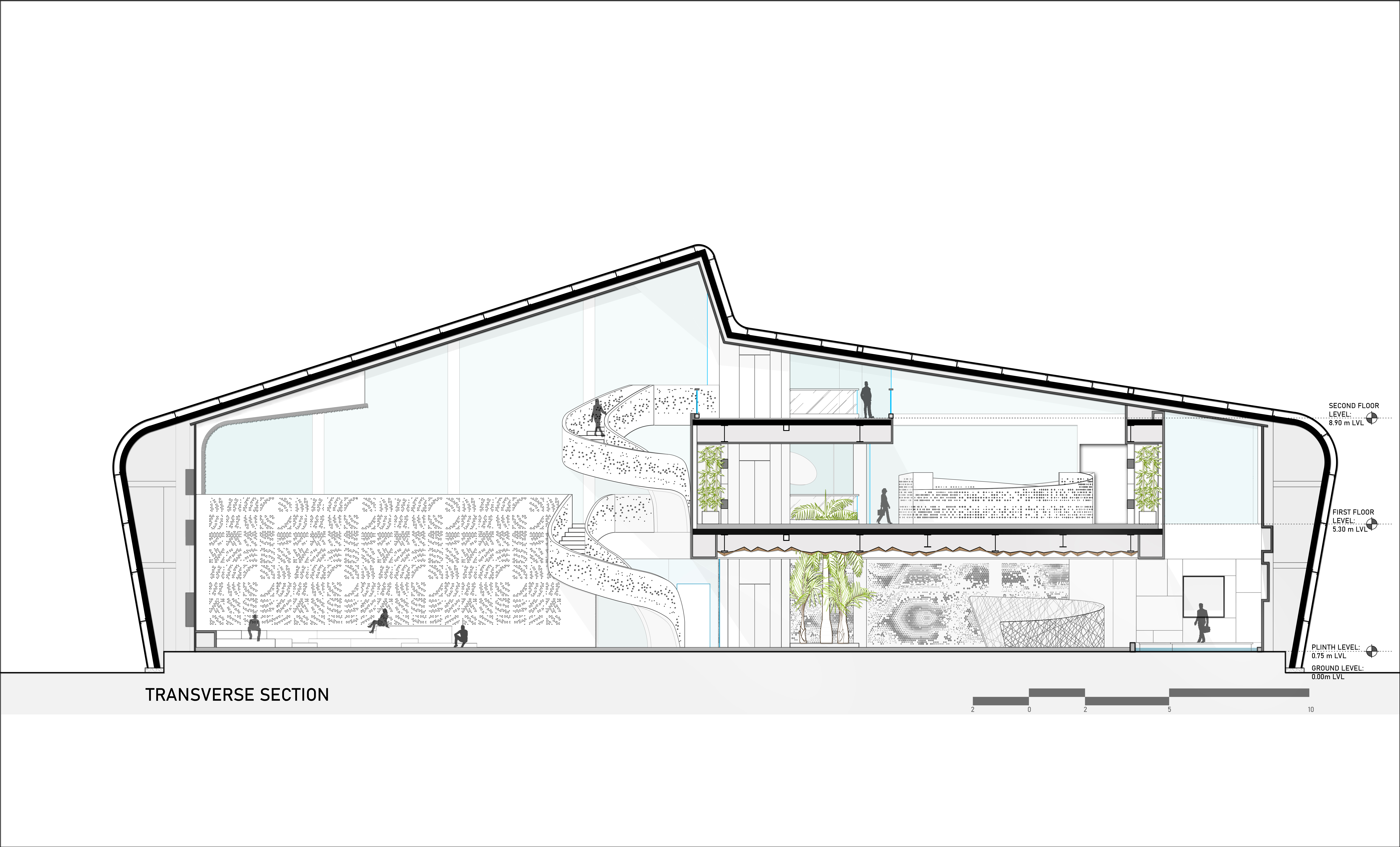 Each of the workstation areas, the discussion rooms, the cabins, conference room, multi-functional space & video conferencing room based upon the client’s brief is individual in identity and arranged organically over 3 levels forming an architectural interior with a composition of varying volumes.