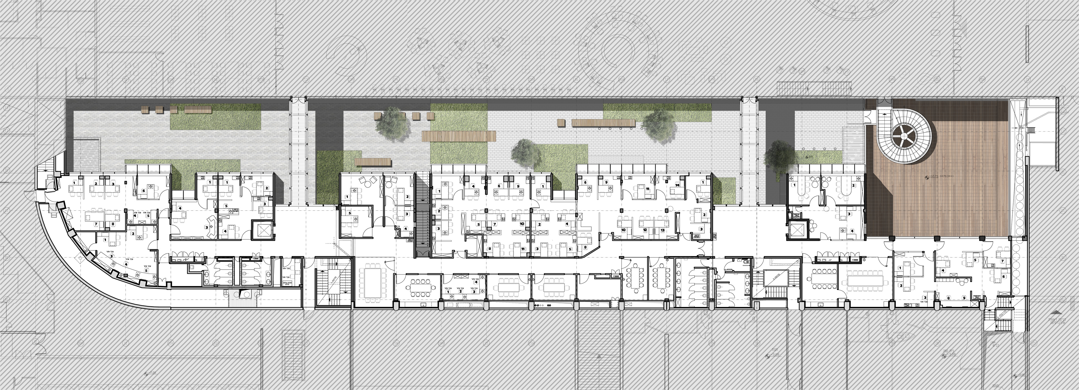 This project is an intervention project in one of the most iconic sites of modernist Israeli architecture – the Oscar Niemeyer planned campus of the University of Haifa. The architecture competition asked for remodeling of existing library spaces and an addition to house office spaces, an auditorium, and new spaces for library collections. The scheme aimed at extracting the original intentions of the campus while updating its weaker moments. That was achieved by placing the new building under an existing parking lot and creating a new open space between it and the existing library. This open space offers new connections between the two parts, and its unique proportions allow for the evaluation of the linear intensity of the original design. The material strategy is also meant to amplify the qualities of the original by using updated concrete techniques and placing central elements such as circular concrete stairs as an homage to Niemeyer and his always contemporary approach.