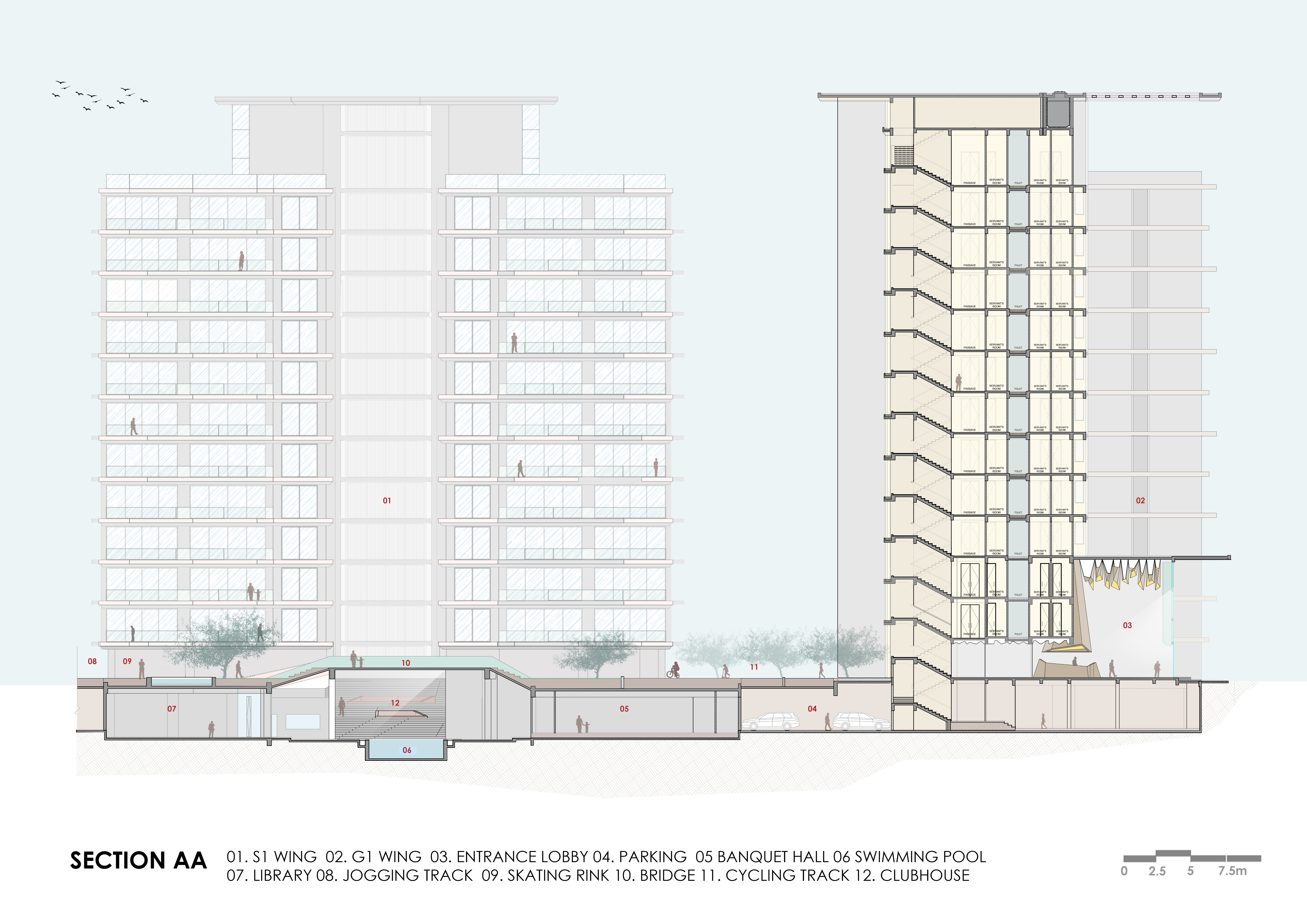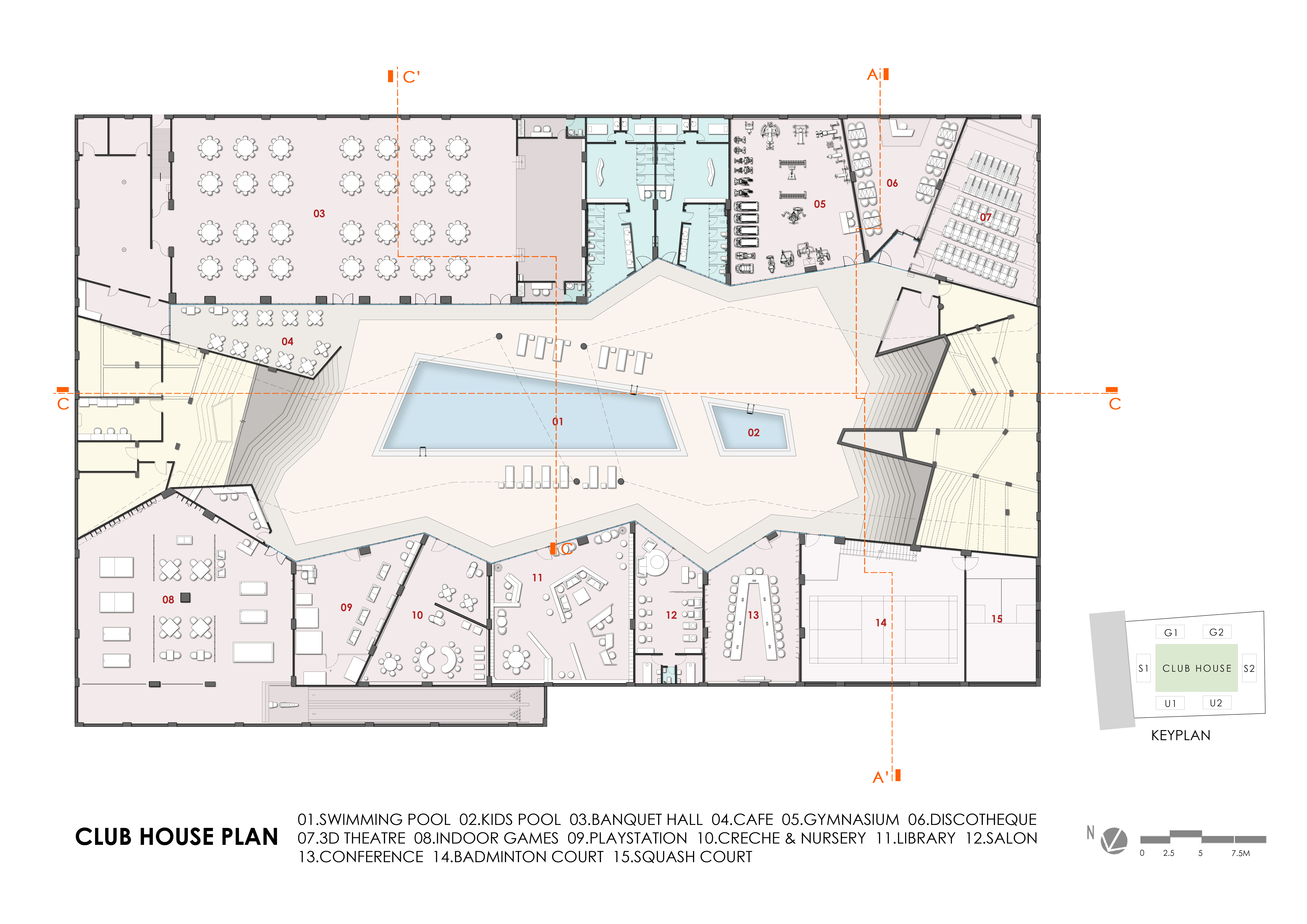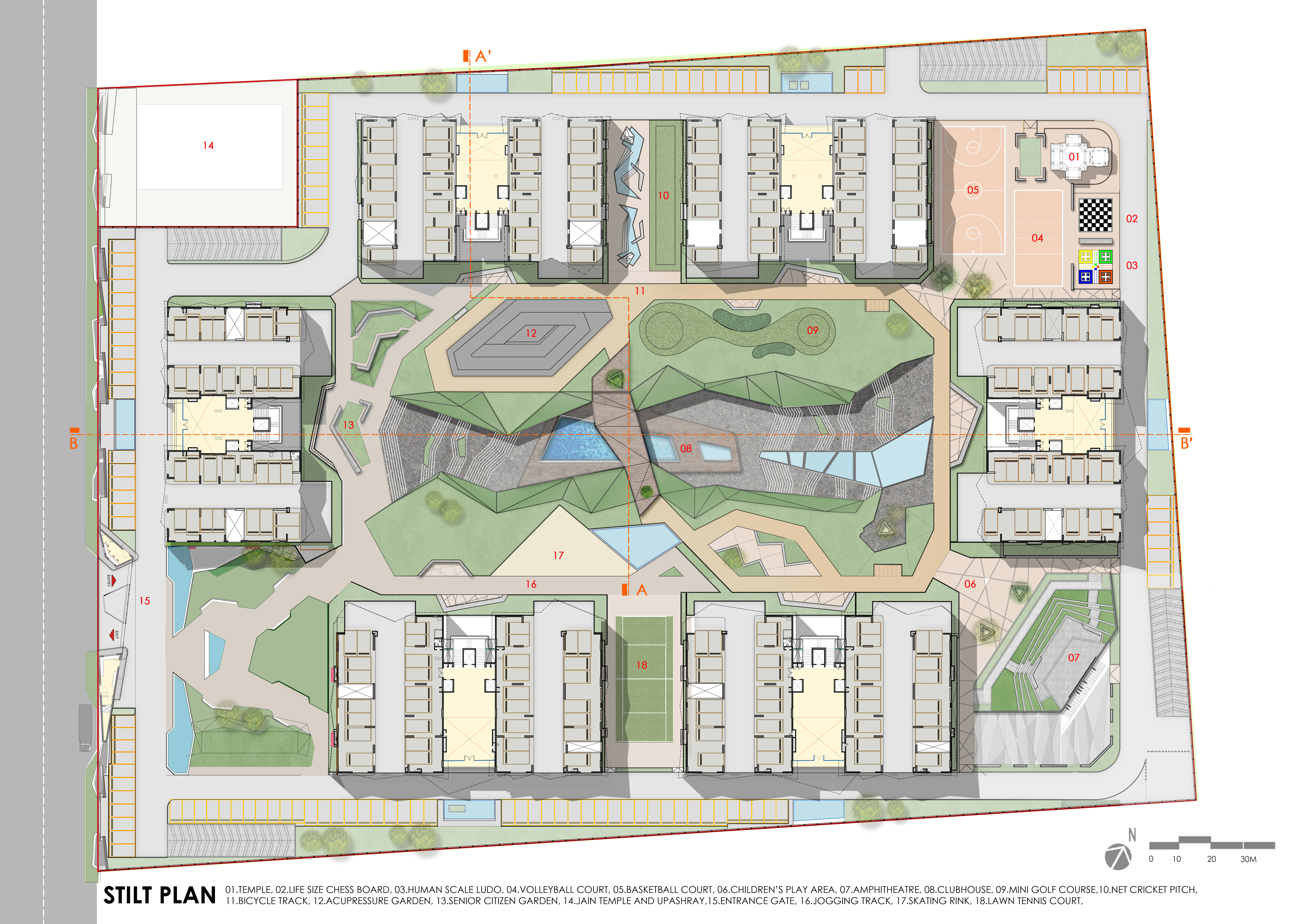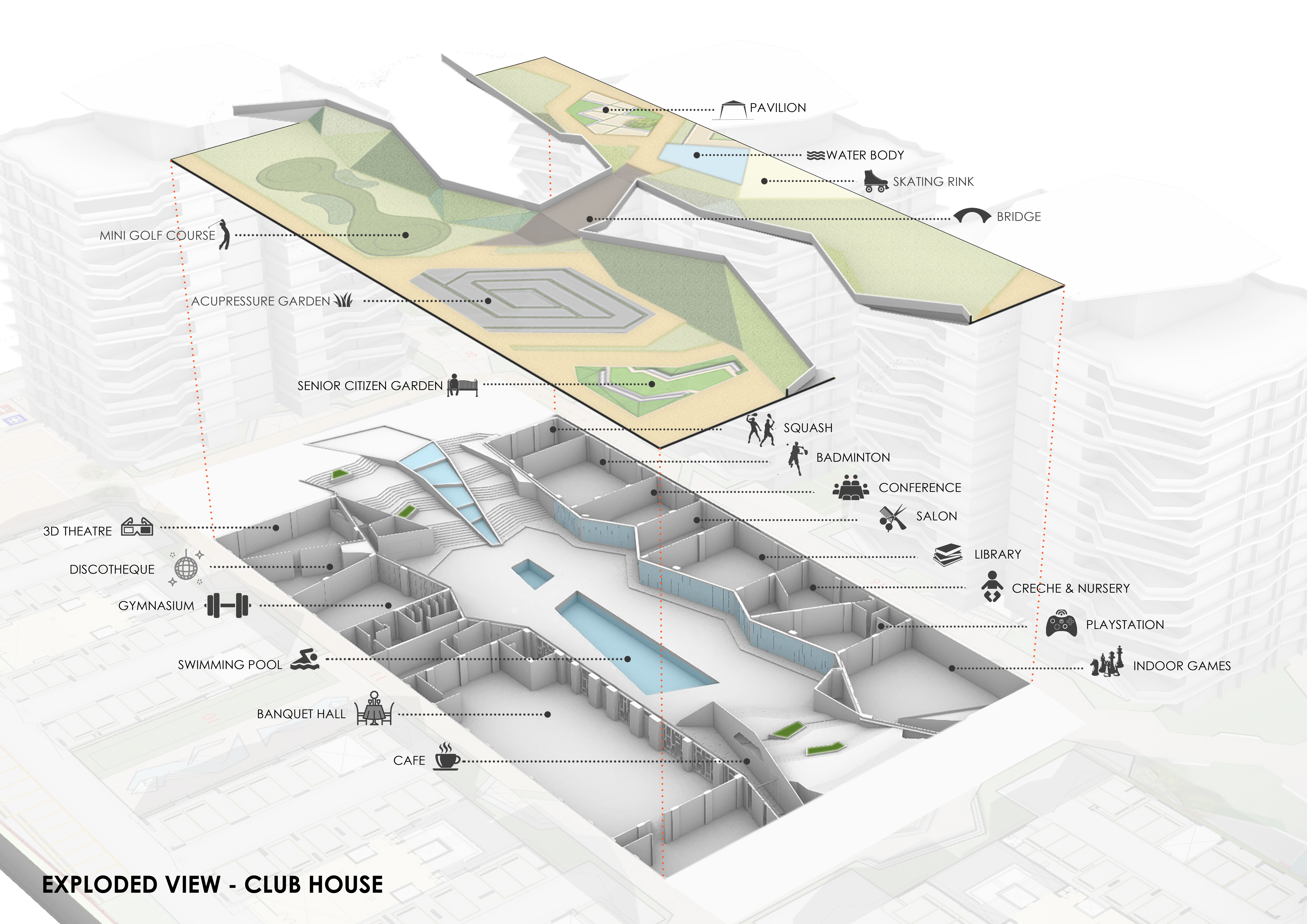 The large landscaped area rises in angular planes revealing a partially sub-terranean recreational club with entertainment & sports facilities that are sheltered from heat gain & simultaneously open to natural ventilation & light.