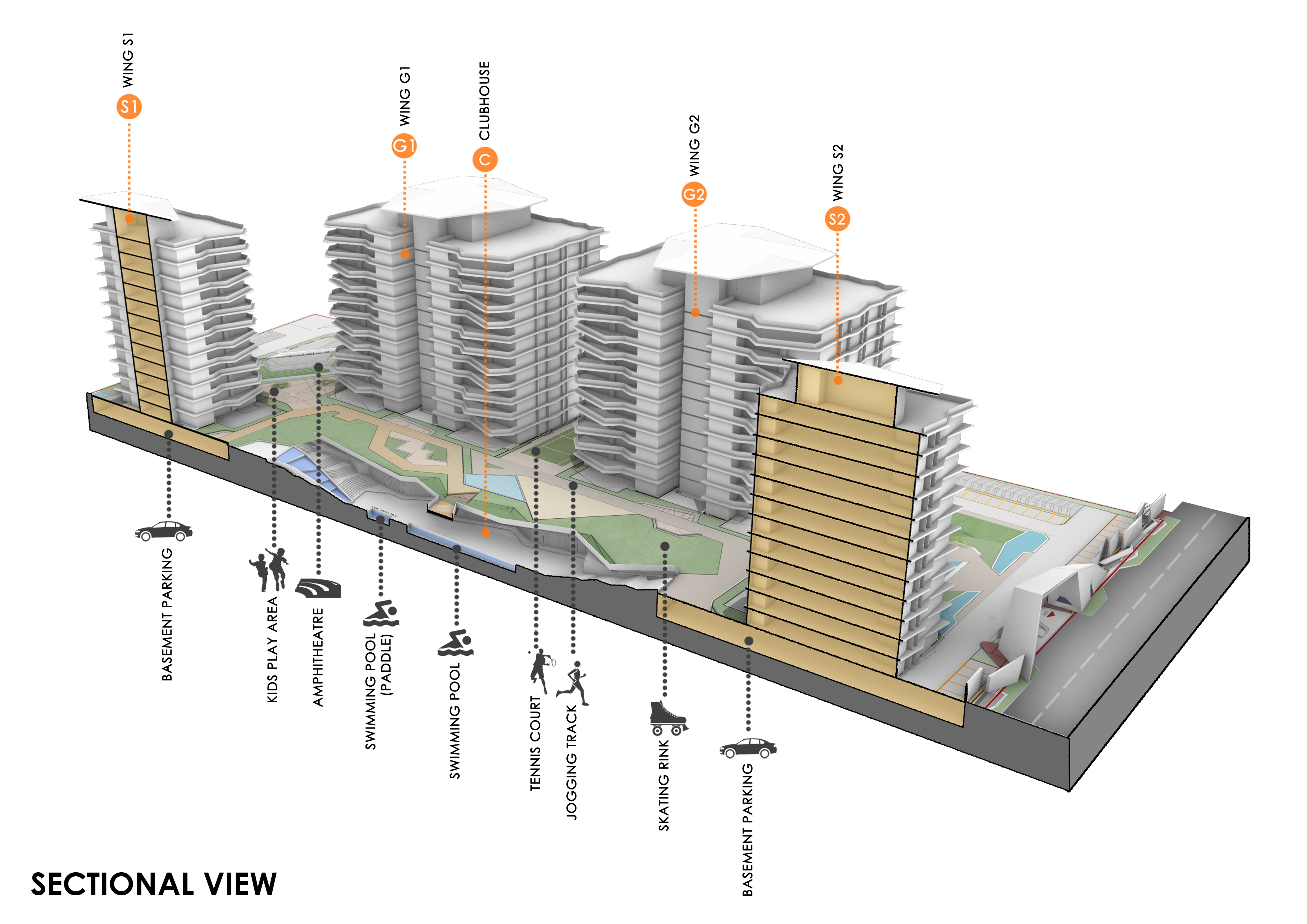 The extensive landscaped space generated by the layout is planned with numerous sports facilities & different areas for different age groups.