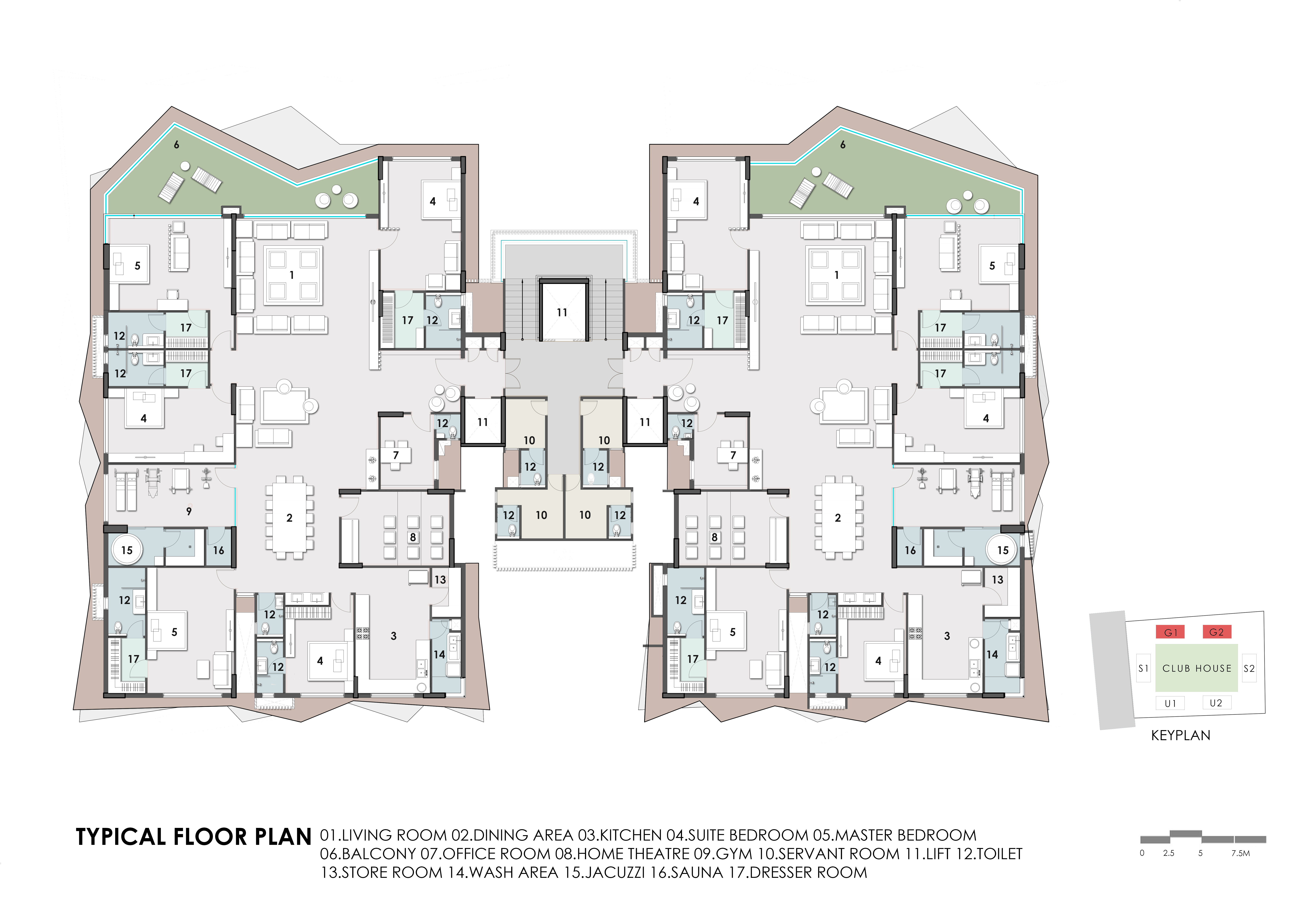 In response to a very specific brief, this housing project has 126 apartments in six buildings of 11 storeys each. Planned in three different sizes these apartments of 750, 850 & 950 sqm are configured with large living spaces, 5 bedrooms, a study & a gym in them.