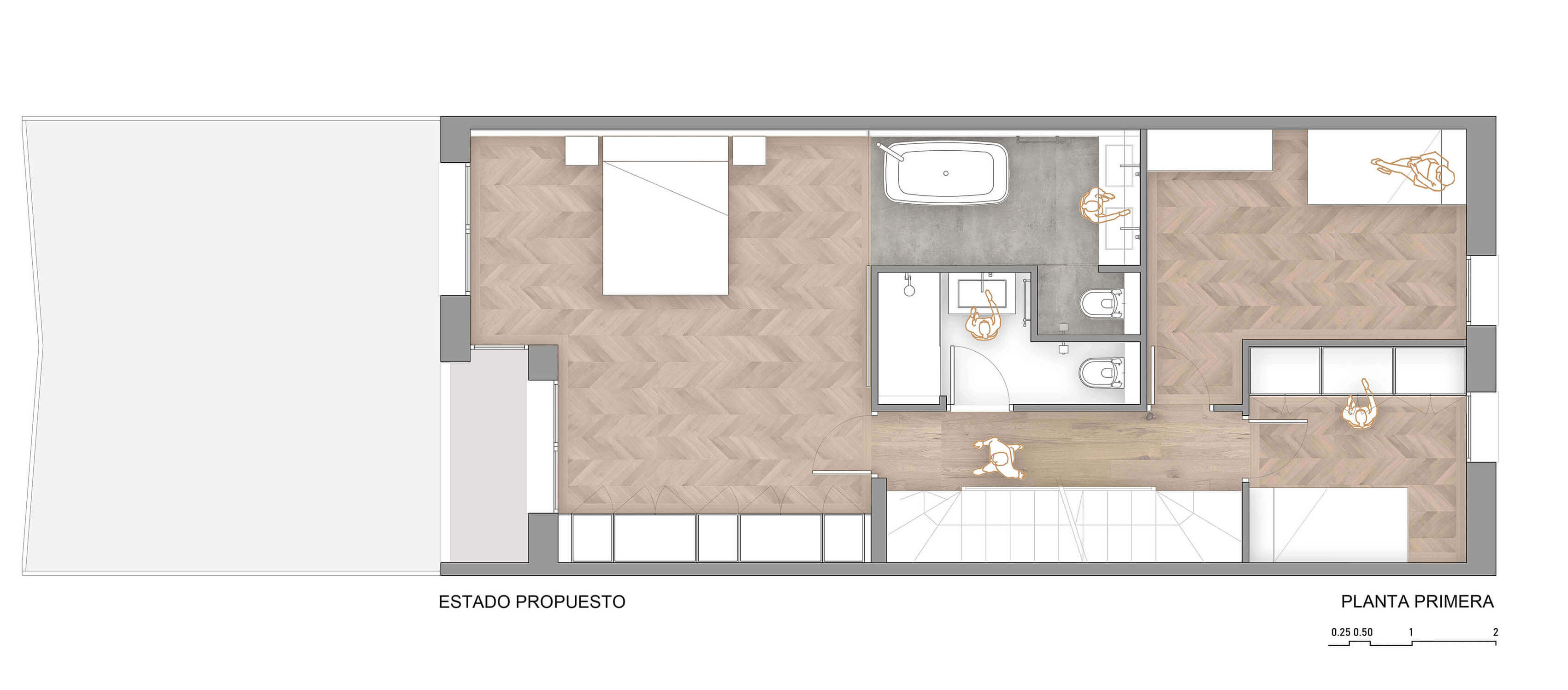 The first floor relinquishes one of its old bedrooms to endow the master bedroom with a light and space that invade everything, even disguising its low ceiling.