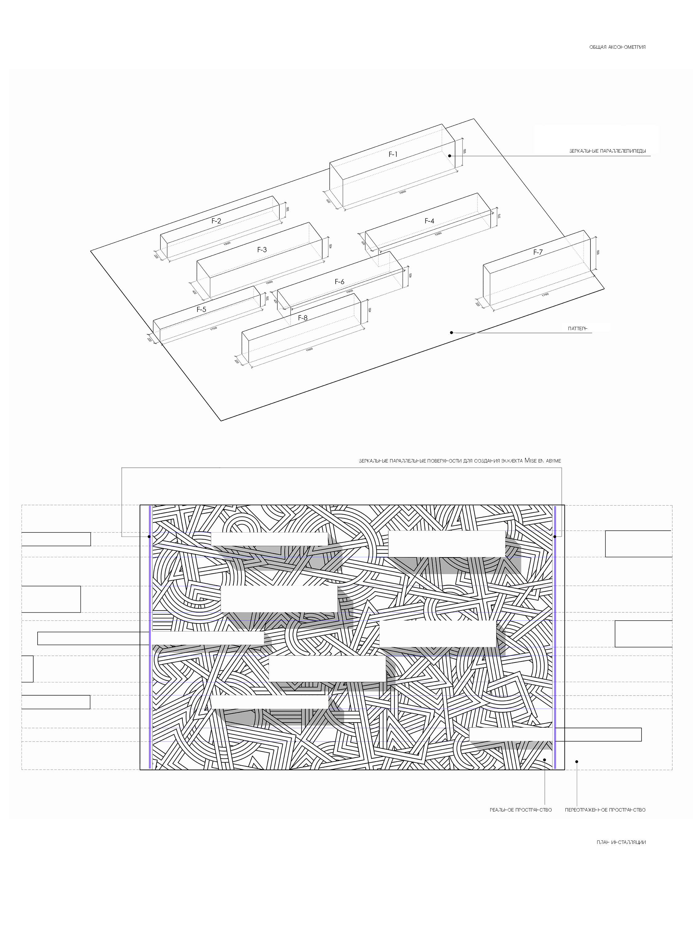 A new reading of the foundations of the ideology of Suprematism focuses on the interweaving of linear figures, and the creation of an endless Suprematist pattern. Conceptually, the installation presents an infinite space through two black squares, created by re-reflecting a pattern and simple geometric volumes in the mirror walls, with a reference to Suprematist linear compositions. The composition between the two re-reflected spaces therefore represents the exit of the modern reading of the geometry of Suprematism into volume.