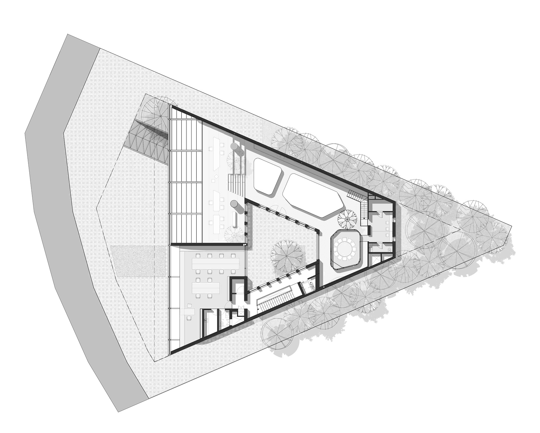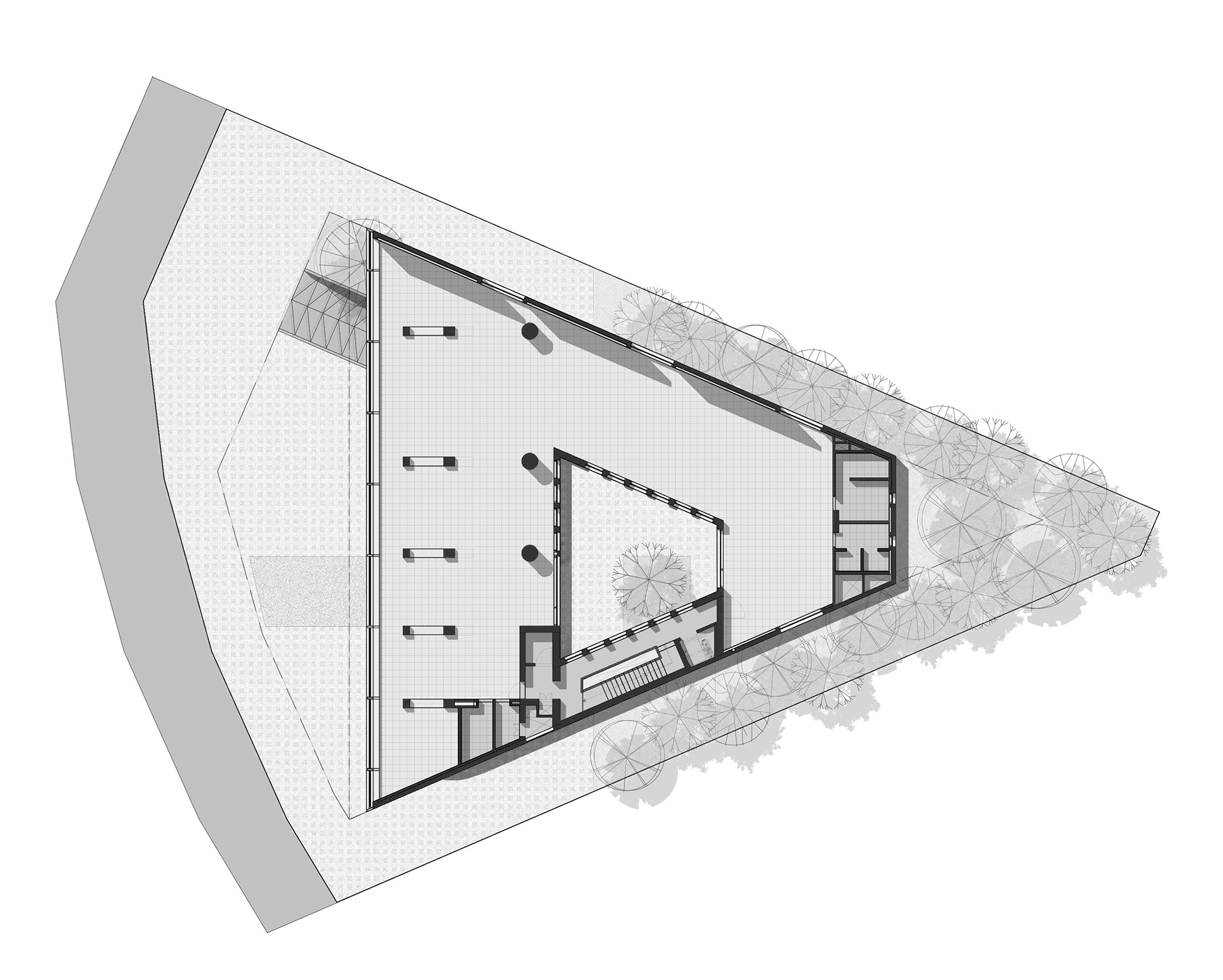 The headquarters establishes a balance between maximum visual presence and minimal physical presence. Limited to just three floors, it is more visually prominent than its actual scale. The structure, with its post-tensioned roof and nine-meter cantilever, allows for a minimum building footprint. It thus liberates the ground floor from all structural elements, enabling a shaded public plaza as an open flexible space that can host various curatorial programs.