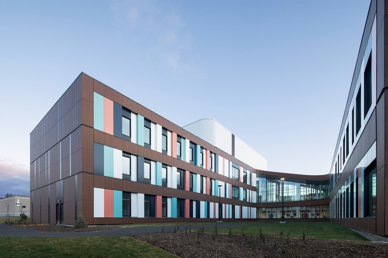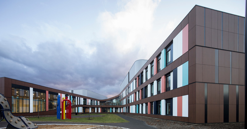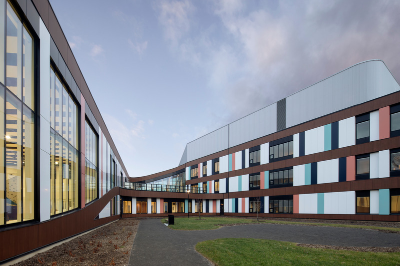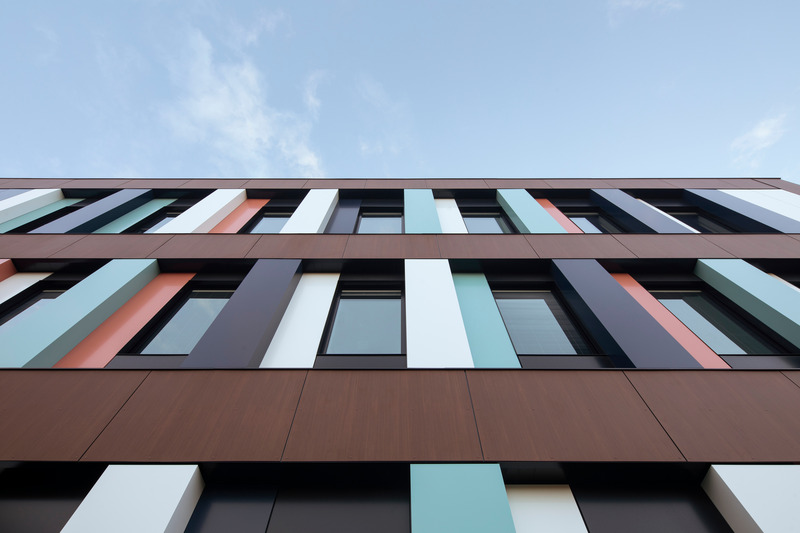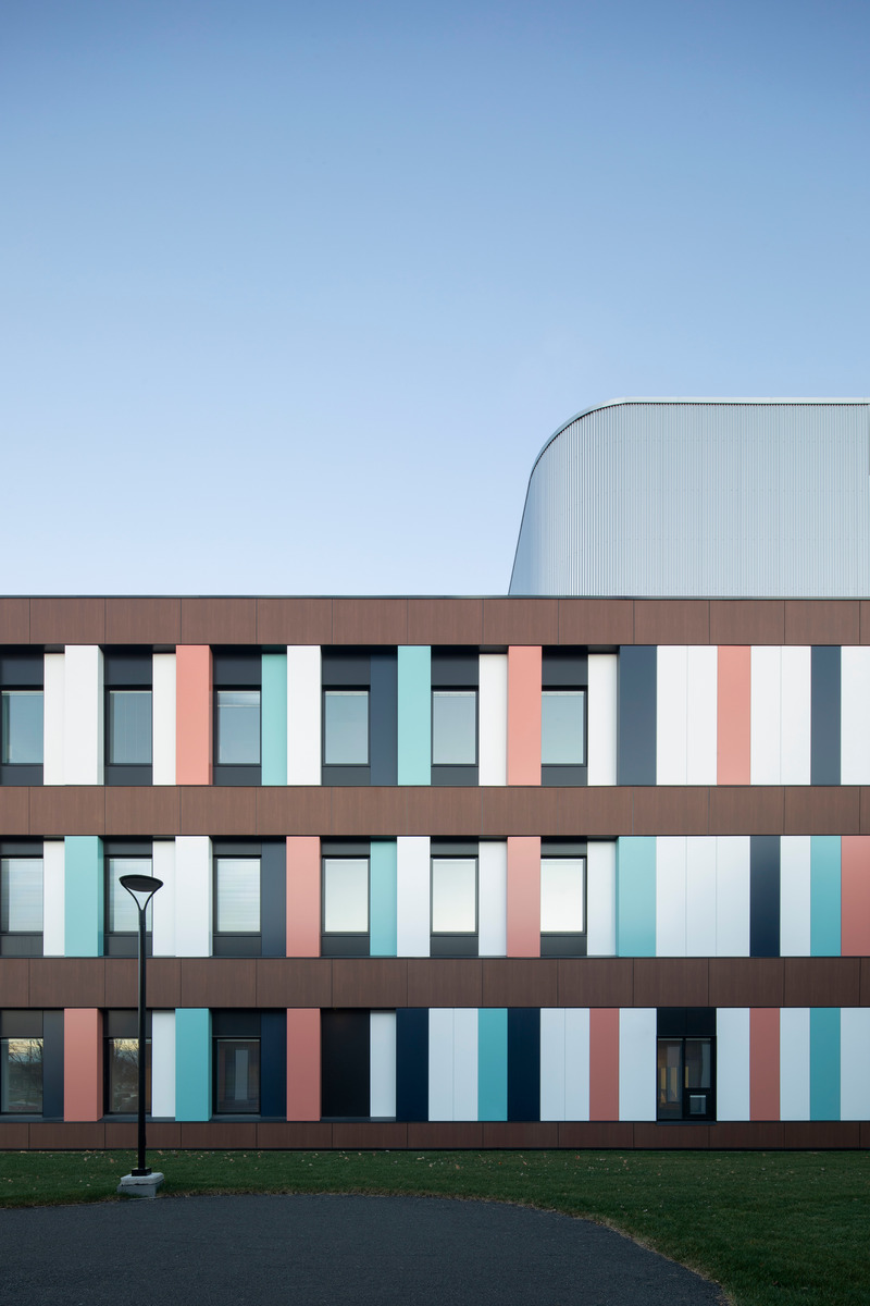 À cela s’ajoute un parement de panneaux aux teintes pastel, répartis de manière aléatoire et rythmée sur les façades. Ce jeu de couleurs douces et non hiérarchisées génère une texture vibrante qui brise délibérément la monotonie et l’effet de rigidité que l’on associe trop souvent à l’architecture hospitalière, carcérale ou strictement fonctionnelle. Le bâtiment prend ainsi un visage plus accueillant, plus accessible, presque ludique sans jamais infantiliser.