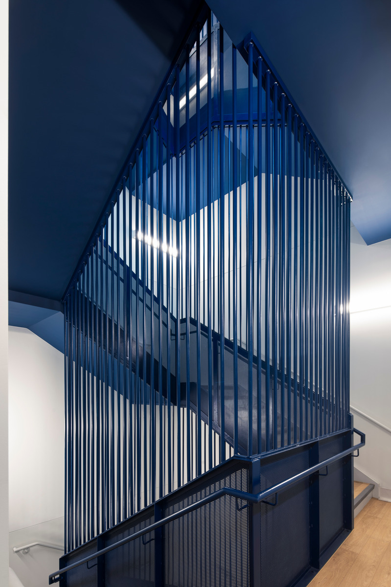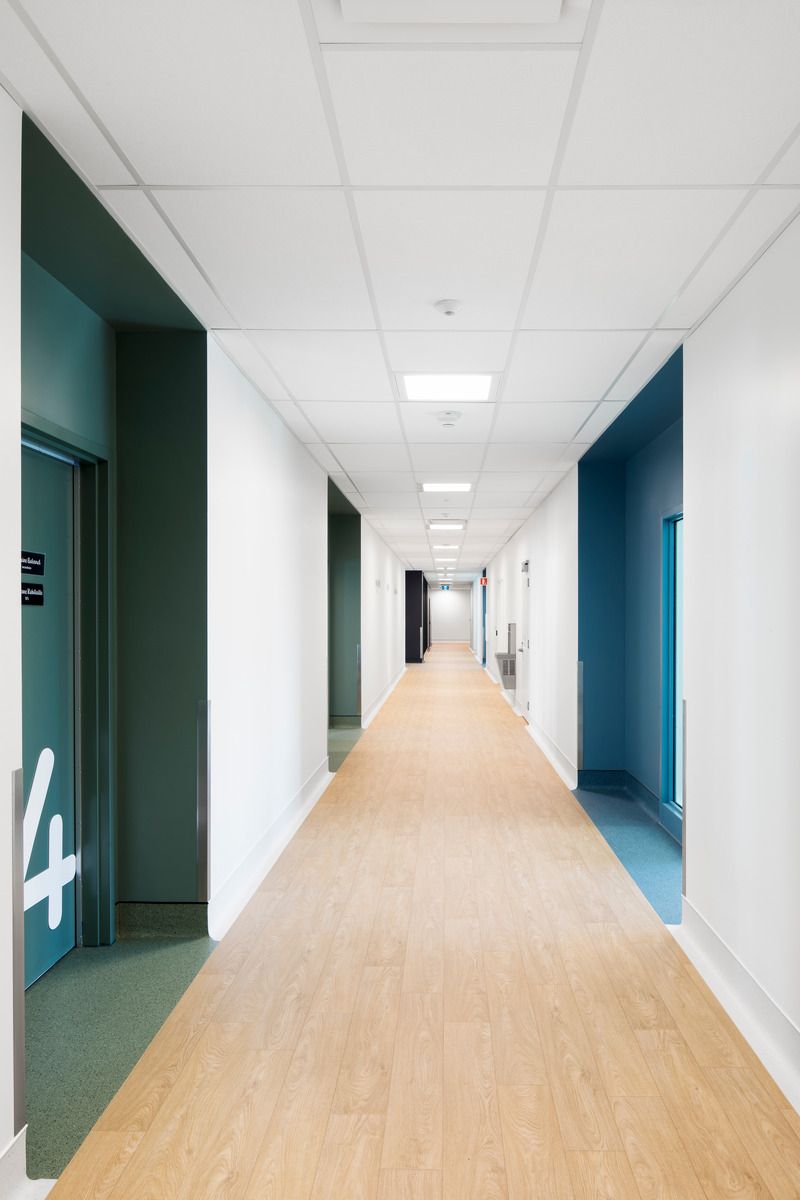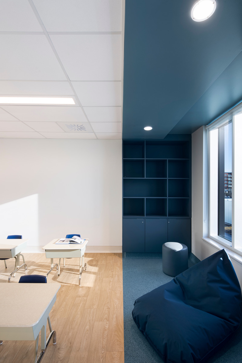 Au sein de cette aile éducative, les espaces d’enseignement ont été conçus avec le même souci de fluidité, de repérage et de bienveillance. Chaque salle de classe est identifiable par un seuil coloré distinct, un repère visuel simple, mais efficace qui permet aux jeunes de se situer facilement dans l’espace. Cette signalétique intuitive participe à renforcer leur sentiment de maîtrise et d’autonomie dans un environnement souvent chargé d’appréhensions.