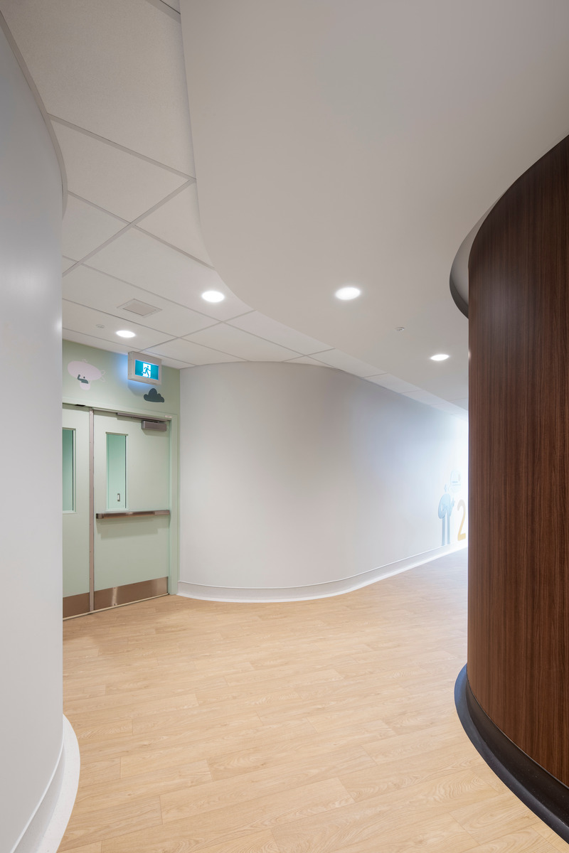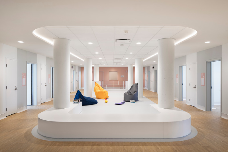 Ce soin apporté à la matérialité — bois naturel, formes courbes, teintes pastel — traduit une volonté claire : créer un environnement qui apaise sans neutraliser, qui encadre sans oppresser. Une architecture qui établit dès l’extérieur les conditions d’une relation de confiance.