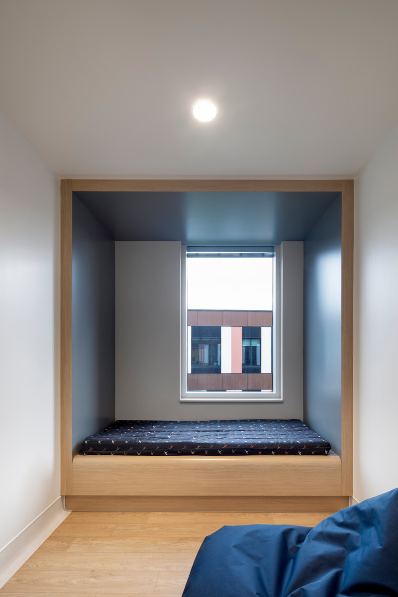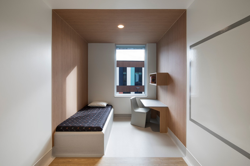 Dans les unités de vie, cette approche architecturale bienveillante atteint son apogée. Chaque chambre est conçue comme un cocon : murs de bois, lumière douce, alcôve paisible. Loin d’évoquer l’isolement ou la punition, ces espaces s’ouvrent sur une aire commune généreuse et lumineuse, propice au dialogue. Le projet fait le choix assumé de la porosité : entre les jeunes, entre les espaces, entre l’intime et le collectif.
