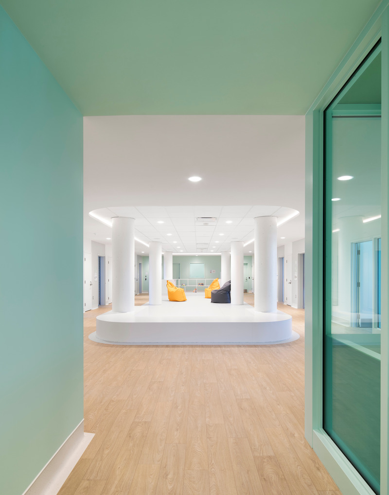 Au cœur du volume institutionnel — regroupant l’école, le gymnase, les bureaux des professionnels de la santé et le centre de détention temporaire (urgence sociale) —, un passage transversal relie cette première aile aux trois ailes résidentielles, chacune abritant des unités de vie adaptées à différents groupes d’âge. Plus qu’un simple lien physique, ce passage incarne une transition symbolique : il marque le seuil entre deux univers — entre l’école et la maison, entre un rendez-vous thérapeutique et un retour à l’intimité. Dans les deux directions, il agit comme un sas à la fois spatial et émotionnel.