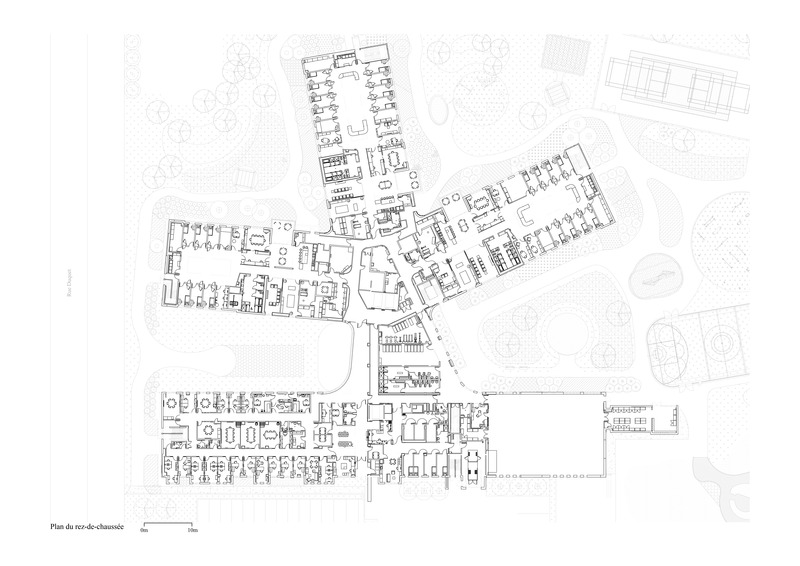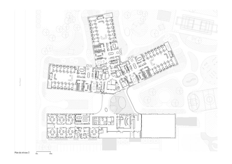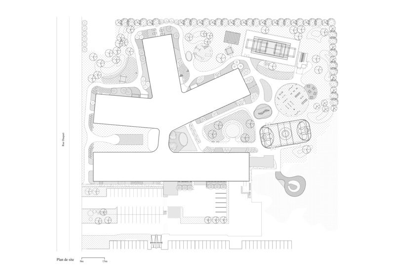 À la périphérie du site, une ceinture végétale dense agit comme un filtre. Elle masque les clôtures, adoucit les limites physiques du centre, et confère à l’ensemble une atmosphère confidentielle et apaisée. Ce choix évite toute impression d’enfermement, tout en répondant aux impératifs de sécurité.