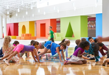 Moveable foam furniture and corridors that incorporate engaging colors and shapes encourage students to move around, engage and interact with each other in between classes.