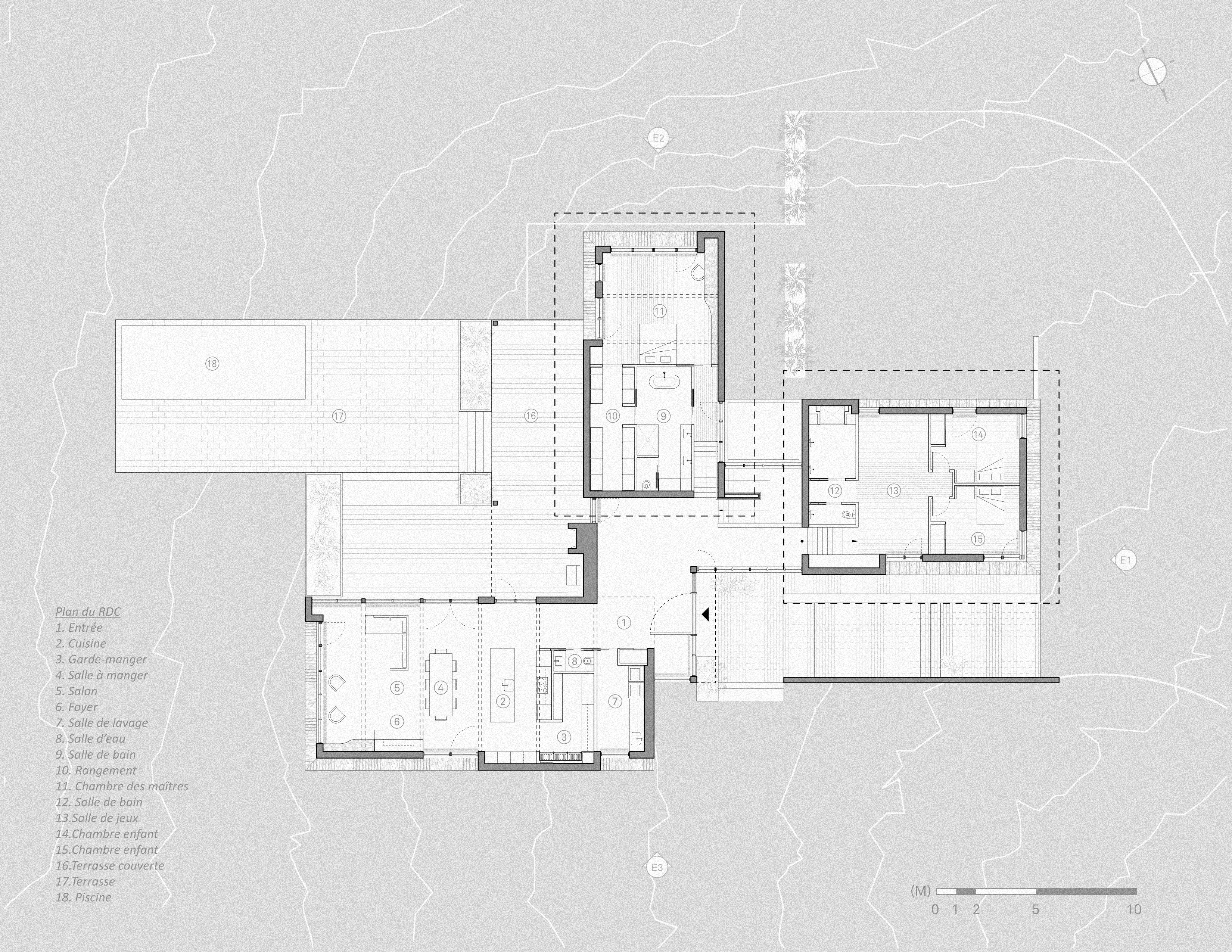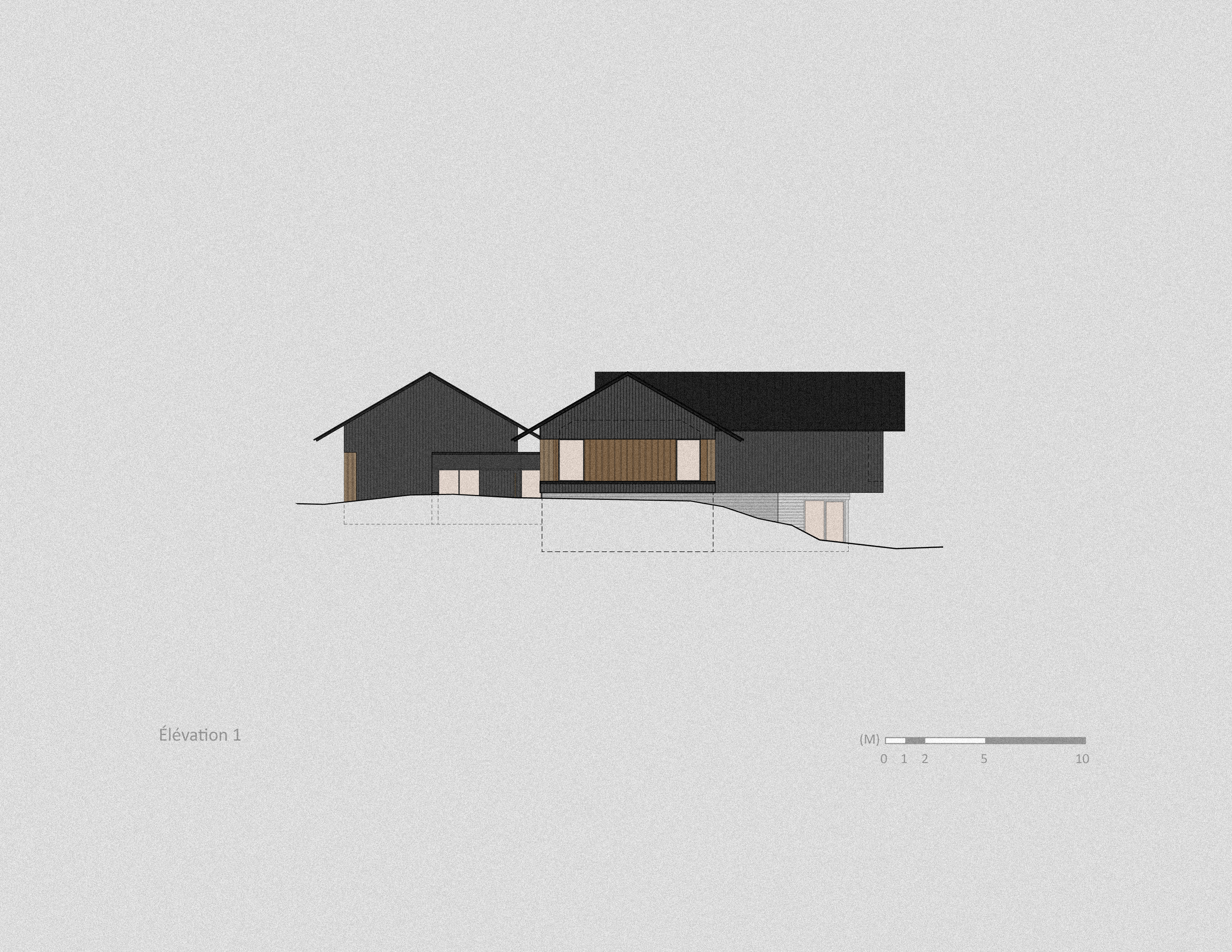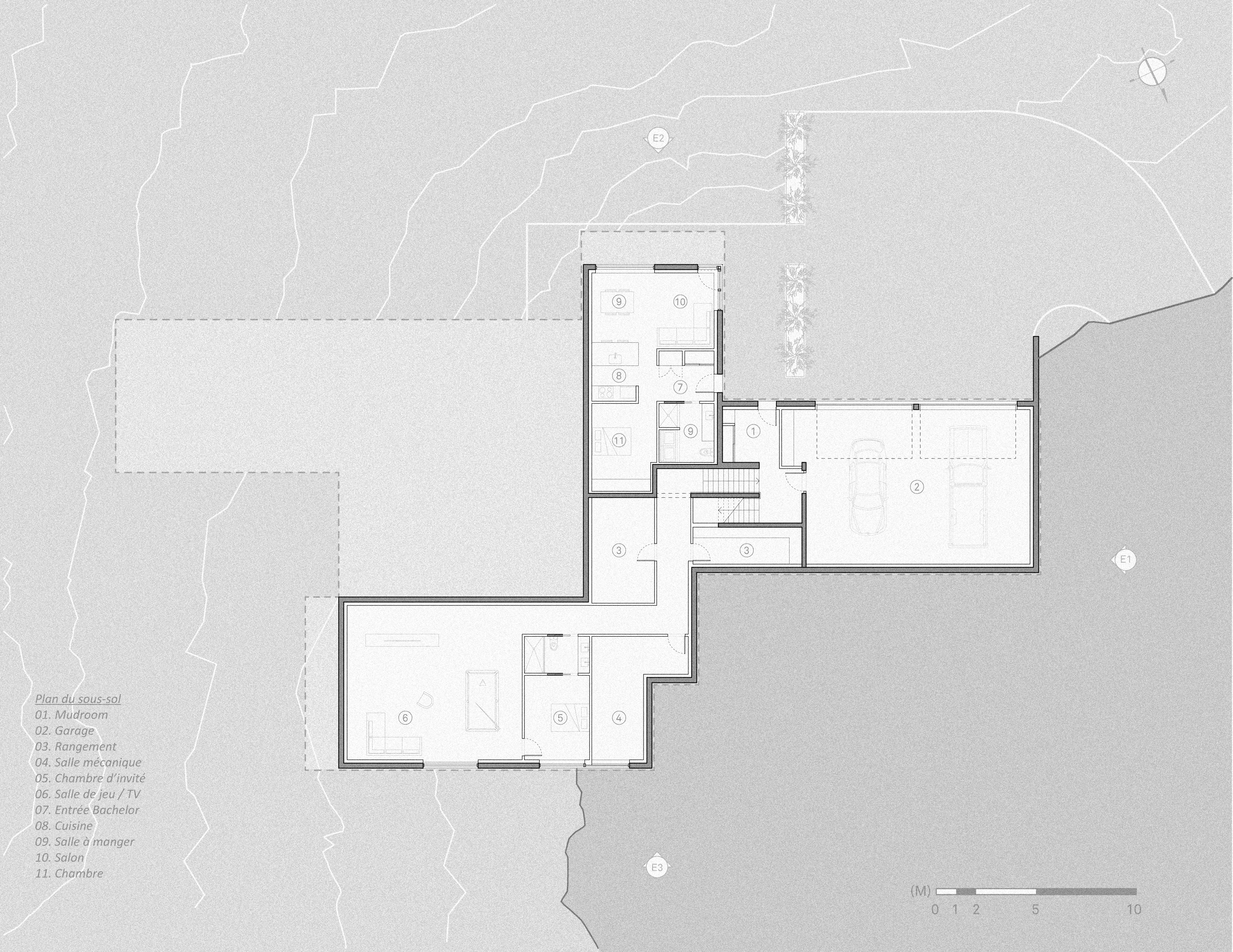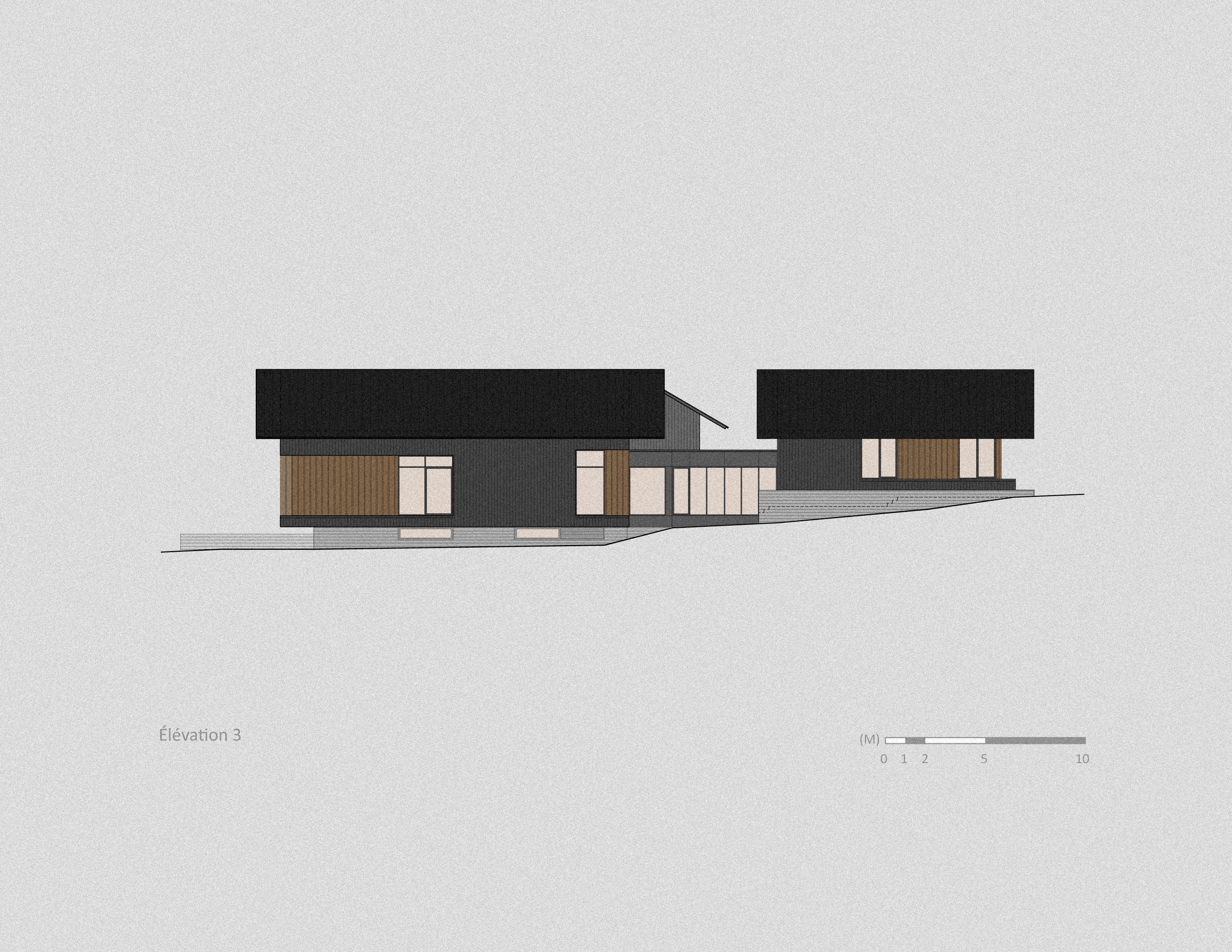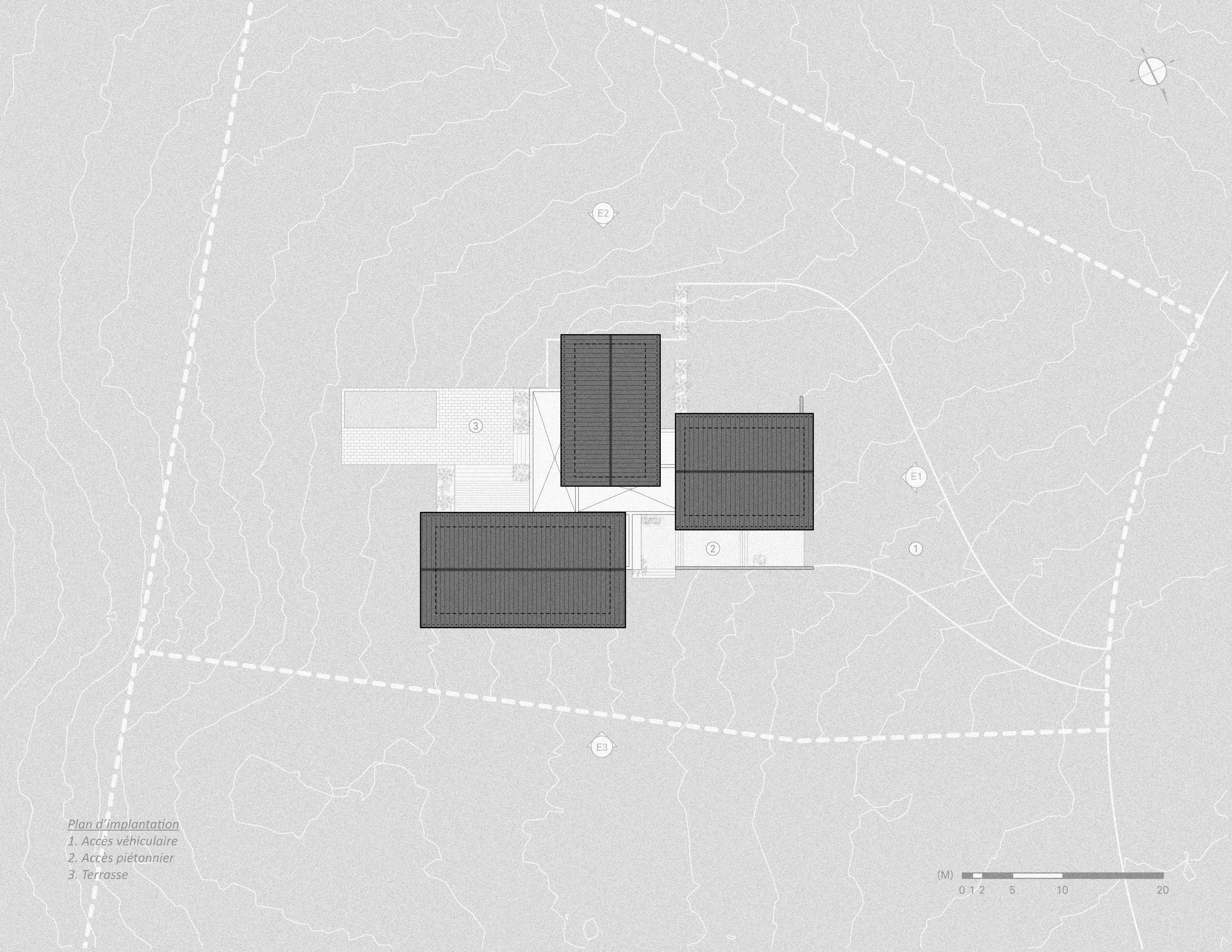 Le projet se tourne plutôt sur ce rapport au temps, en structurant un mode d’implantation lié aux caractéristiques topographiques plutôt qu’à une logique de maison unifamiliale en rangée, typique des zones suburbaines. La morphologie du projet distingue de façon matérielle les éléments plus permanents de la résidence, en béton, et les composantes plus éphémères en bois. Tel un bas-relief sculptural, les principaux axes de circulation sur le site deviennent les 2 axes de composition de l’ensemble. Différents murs de soutènement en béton, plateaux et escaliers de transitions installent une nouvelle topographie sur le site, une structuration déterminante pour la suite des choses. Des forages profonds de géothermie “ancrent” la composition dans la pérennité et adresse à sa façon les enjeux énergétiques, d’une manière métaphorique plutôt que strictement technique.